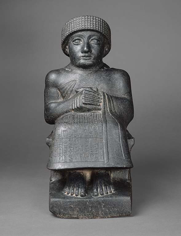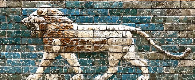 All images are from Wikimedia Commons. From the upper left corner: student exercise tablet, a hymn to Marduk, the Burney relief, Sumerian votive statue, lion relief from the Ishtar Gate, the Head of Sargon, statue of king Gudea, relief from an Assyrian palace, the Victory Stele of Naram-Sîn, and the Babylonian map of the world.